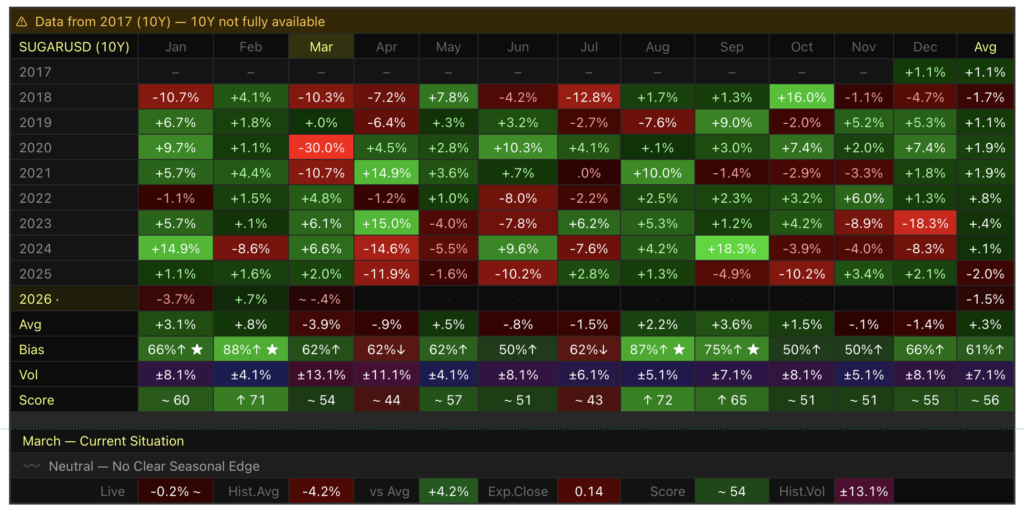 Ein konkreter Tipp zur Nutzung: Schau dir den „Against Seasonal“ Status besonders genau an. Wenn ein Monat historisch stark bullish war (Score über 65), der aktuelle Monat aber klar negativ läuft — dann passiert gerade etwas, das du fundamental erklären können solltest. Entweder findest du den Grund (OPEC-Entscheidung, Ernteschock, Makro-Stress), oder du bist vorsichtig mit dem Trend-Trade nach unten. Mean-Reversion-Setups entstehen hier genauso wie Trendbrüche — aber keines davon ohne weiteren Kontext einfach blind handeln.